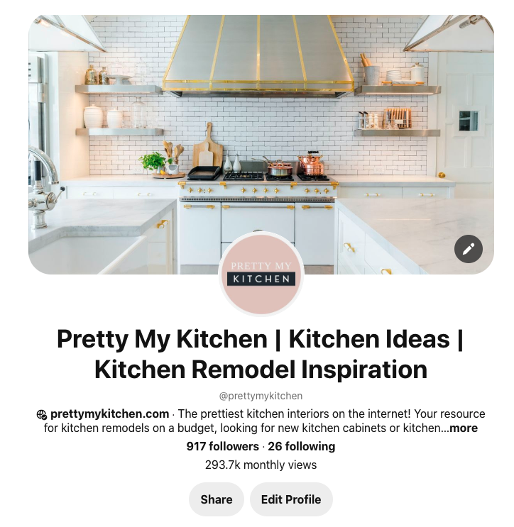 This is the board list for one of our home decor bloggers. This account focuses on kitchen design, so you will see broad terms like “Kitchen Ideas” and more specific terms like “Cream Kitchen Cabinets”. We wanted to have board names that covered a whole area of expertise.